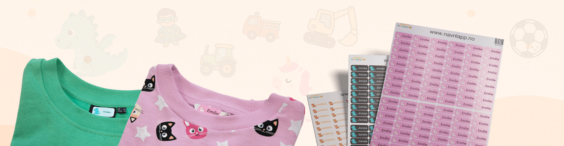 Navnelappene våre er laget for å tåle maskinvask, tørketrommel og daglig bruk. Kvaliteten er testet til å vare hundrevis av vask – uten at trykket falmer eller løsner.